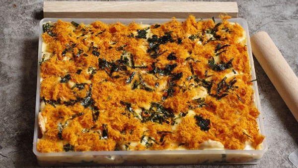 Rải đều phần lòng đỏ trứng muối đã để dành lên mặt bánh. Tiếp theo, rắc đều hỗn hợp chà bông, mè rang và rong biển đã chuẩn bị lên trên.