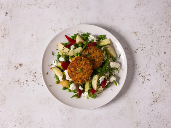 500g cá hồi, 25g hạt lanh, 25g bột mì không chứa gluten, 10g hành tây xắt nhỏ, 10g thì là xắt nhỏ, 25g hành lá xắt nhỏ, 5g muối, 5g bột tỏi, 5g hạt tiêu đen. 5g ớt bột, 25ml nước cốt chanh.