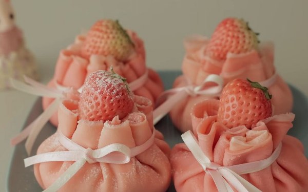 Bánh crepe dâu hồng hình chiếc túi nhỏ xinh xắn. Vỏ bánh mềm, dai, phần nhân kem béo ngậy, mịn màng, mát lạnh. Phần dâu tây ngọt thanh, giòn mát ăn cùng với bánh rất ngon, không bị ngán. Thưởng thức ngay bạn nhé!