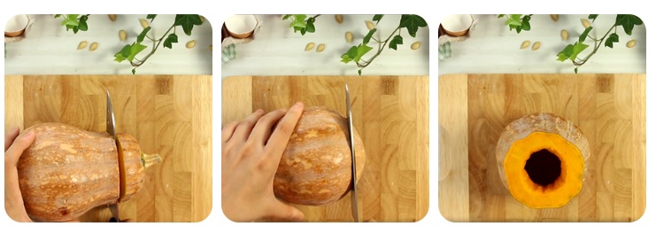 Bí đỏ rửa sạch, cắt phần cuống và phần đế, sau đó dùng dao rạch một đường tròn bên trên và bắt đầu dùng muỗng khoét ruột và hạt bên trong bí để tạo khoảng trống rộng chứa phần flan.