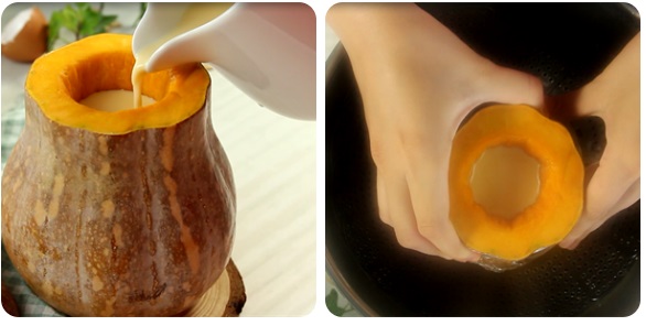 Chuẩn bị nồi hấp, đặt bí ngô vào trong nồi, sau đó rót hỗn hợp flan vào trong quả bí, lưu ý không nên rót đầy đến mép mà chỉ rót gần đầy, chừa lại một khoảng nhỏ vì sau khi hấp chín hỗn hợp flan sẽ nở lên. Hấp khoảng 45-50 phút đến khi phần flan đông lại, cho tăm vào thấy tăm sạch không dính là được.