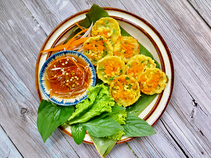 Bánh khọt chay không có thịt, tôm nhưng vẫn bùi bùi vị đậu xanh, vỏ giòn tan, chấm cùng nước chấm chua ngọt vừa miệng.