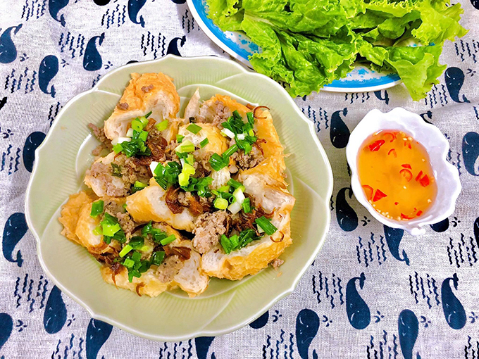Bánh mì hấp thịt băm, cuốn cùng rau và chấm với nước mắm chua ngọt, có thể dùng để ăn sáng hoặc làm bữa ăn nhẹ.
