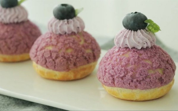Bánh su kem việt quất vỏ giòn có hình thức rất đáng yêu, bắt mắt. Bánh có lớp vỏ trên cùng thơm việt quất, giòn giòn. Kem béo ngậy, mát lạnh. Bánh su dai dai rất ngon. Thưởng thức ngay bạn nhé!