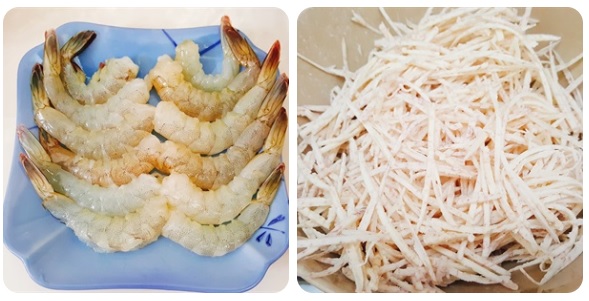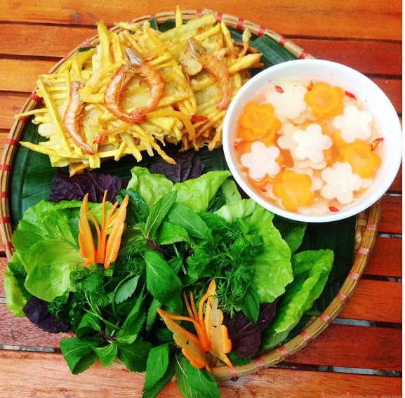 Bánh có khoai môn bùi bùi thơm thơm, thêm con tôm mềm ngọt đậm đà. Bánh có thể ăn kèm với nước mắm chua ngọt và rau sống, hay đơn giản hơn là chấm với tương ớt thôi cũng ngon.