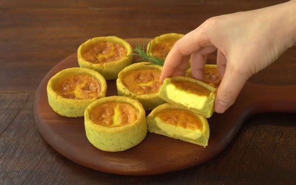 Bánh trứng khoai lang nướng có hương thơm rất hấp dẫn. Đế bánh làm bằng khoai lang nên vừa giòn vừa béo bùi. Nhân trứng bên trong mịn màng, béo ngậy, không quá ngọt nên không hề bị ngán.