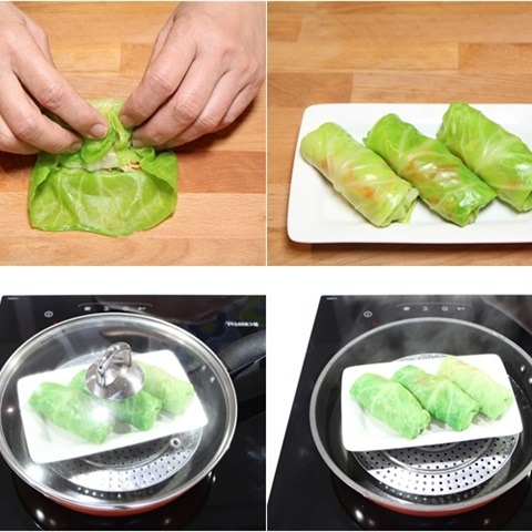 3. Bạn lấy lá bắp cải, cắt bỏ phần đầu, thêm rau củ vào giữa và cuộn lại như cuốn nem. Lấy lá bắp cải, cắt bỏ phần đầu, thêm rau củ vào giữa và cuộn lại như quấn nem.