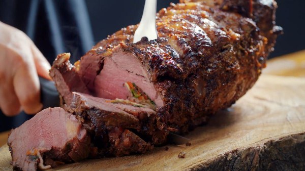 Lạng mỏng 4 kg nạc lưng bò. Ướp thịt bò với 1 ít muối, tiêu xay, tiêu đỏ, lá thyme, hương thảo, dầu ô liu. Dùng tay massage nhẹ nhàng để thịt bò thấm đều, ướp thịt trong 20 phút.