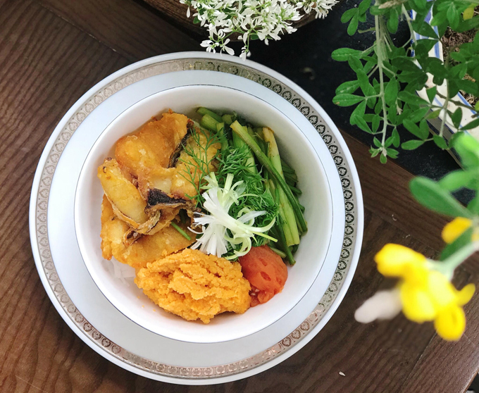 – Bún chần sơ bằng nước nóng. Cho bún vào bát tô, xếp cá chiên giòn lên trên. Sau đó chần rau cần cho chín, thêm ít hành, thì là và vài lát ớt cay rồi từ từ chan nước dùng lên và thưởng thức.