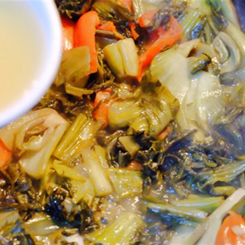 Tiếp đó cho dưa chua vắt bớt nước vào xào cùng, nêm nếm gia vị cho vừa miệng. Bạn cho gừng thái sợi và ớt hiểm đập dập vào xào cùng nếu thích ăn cay. Dưa xào chín nếu muốn tăng độ chua có thể chế thêm một bát con dẫm bỗng (nếu dưa nhà tự muối có thể dùng nước muối dưa để tăng độ chua, nhưng chú ý điều chỉnh độ mặn vì nước muối dưa đã mặn sẵn). Lượng nước trong nồi phải chế đủ sao cho đến khi cho cá vào thì xâm xấp mặt cá.