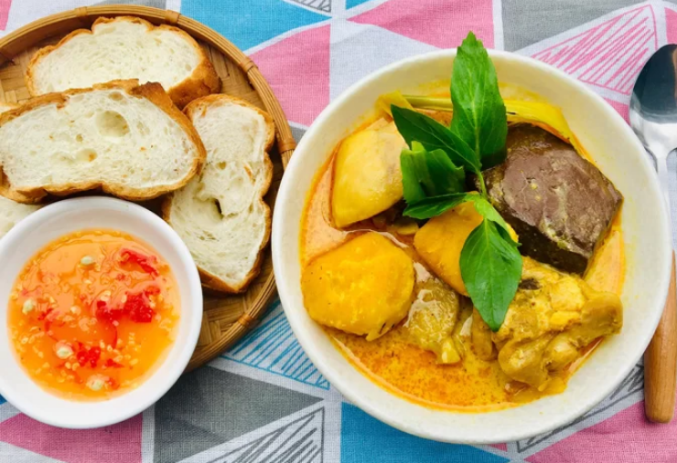 Món cà ri gà cốt dừa thơm vị dừa, ngọt vị gà ăn kèm bánh mì rất phù hợp.