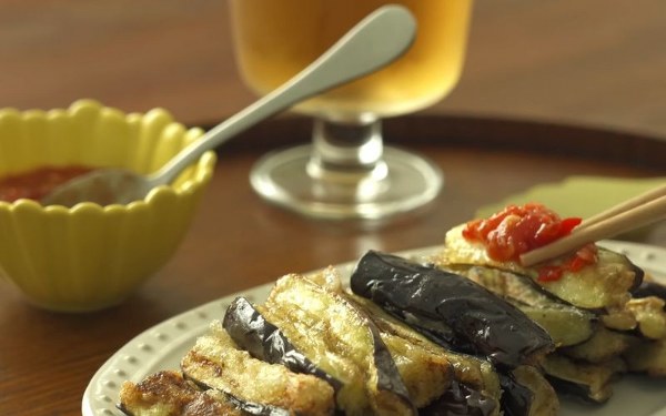 Cà tím được áo một lớp bột mỏng bên ngoài giòn rụm, cà tím bên trong mềm ngọt, thơm thơm. Chấm cà tím cùng với nước sốt cà chua càng thêm hấp dẫn. Nước sốt đặc sệt, chua ngọt, mặn, cay hài hòa, khiến bạn muốn ăn mãi không thôi.