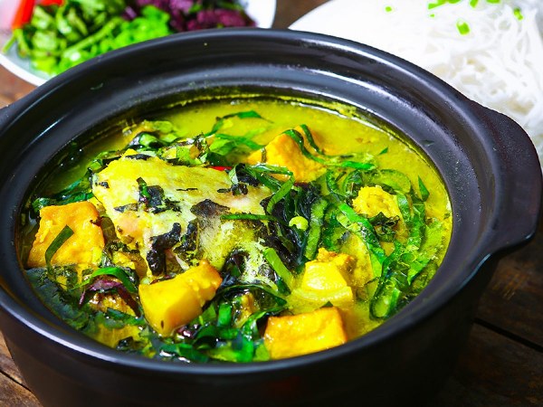 Chuẩn bị 1 chảo khác để xào chuối, đậu, nêm gia vị và 1 thìa bột nghệ. Chế nước đun sôi rồi cho cá vào đun cùng. Đun chừng 15’ là được. Cho giấm bỗng/mẻ, bật sôi rồi tắt bếp. Cho hành lá, rau răm, tía tô vào đảo đều.