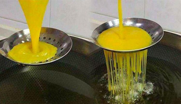 Đầu tiên đập trứng vào bát, đánh tơi, rồi đặt chảo lên làm nóng cho dầu vào đun sôi. Sau đó lấy 1 chiếc muôi thủng. Đặt muôi thủng song song với mặt chảo dầu nóng, đổ trứng vào muôi thủng.