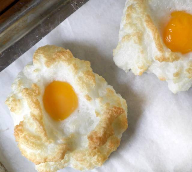 3. Tạo lòng trắng trứng thành hình tròn nhỏ sau đó đặt lòng đỏ trứng lên trên rồi cho vào lò nướng ở nhiệt độ 180 – 190 độ C và nướng trong vòng 14 – 18 phút. Rắc muối, tiêu theo sở thích mỗi người.
