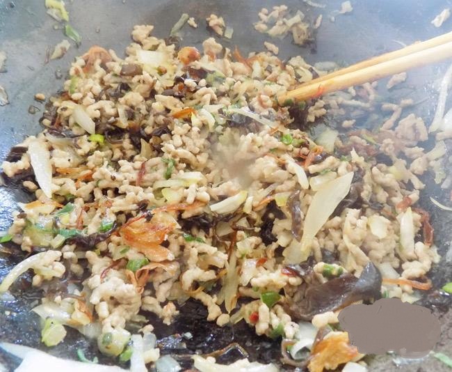 - Sau đó cho thịt vào xào tơi 5 phút. Cuối cùng cho hành tây + nấm mèo và các gia vị còn lại vào xào săn.