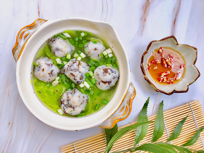Nước canh ngọt thanh nhẹ, chả cá kèm nấm mèo dai giòn lạ miệng, chấm với nước mắm mặn pha ớt, tác dụng giải nhiệt.