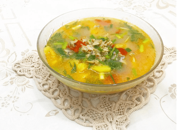 - Tắt bếp, cho hành lá, rau răm xắt nhỏ vào đảo đều, cho canh ra bát tô là có thể thưởng thức.