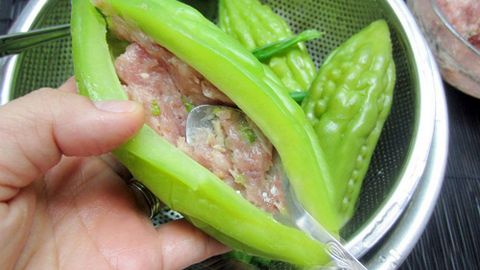 – Ở khoảng thời gian ướp thịt các bạn chuẩn bị khổ qua (mướp đắng). Phần khổ qua mua về bạn phải lựa trái mới hái, thuôn đều và có phần mập mạp lúc nhồi sẽ được nhiều nhân hơn. Để dễ lấy ruột và món ngon được đẹp hơn thì các bạn đem đun một nồi nước. Lúc nước sôi bạn cho thêm một thìa muối và cho khổ qua vào chần ở nước sôi khoảng một phút. Sau đó thì tắt bếp và cho khổ qua ngâm ngay vào nước lạnh có chút đá càng tốt.