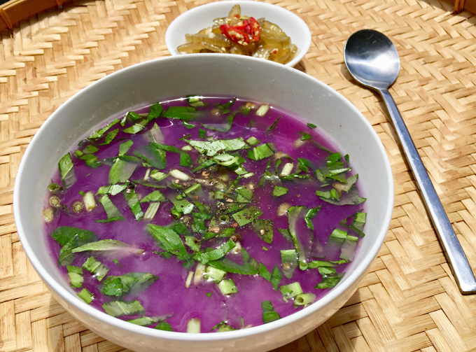 Canh khoai tím khô thường được ăn cùng dưa mắm và cơm nóng. Món ăn này thanh đạm, ít mỡ, thích hợp vào ngày hè.