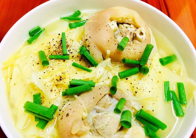 Chân giò heo mềm ngọt, nước dùng đậm đà, thanh thanh, nấu cùng măng tươi giòn. Khi ăn, móng giò chấm cùng mắm ớt cay tê, hấp dẫn.