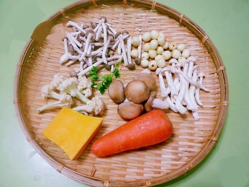 Bước 1: Cho nồi lên bếp với 1 thìa dầu đậu nành đun nóng thì cho hành khô vào phi thơm. Sau đó cho cà rốt, hoa lơ, bí đỏ, nấm hương tươi vào xào đảo vài lượt.