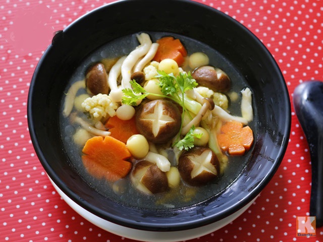 Canh nấm chay có vị ngọt tự nhiên từ rau củ, nấm, vị bùi bùi của hạt sen thơm ngon và bổ dưỡng.