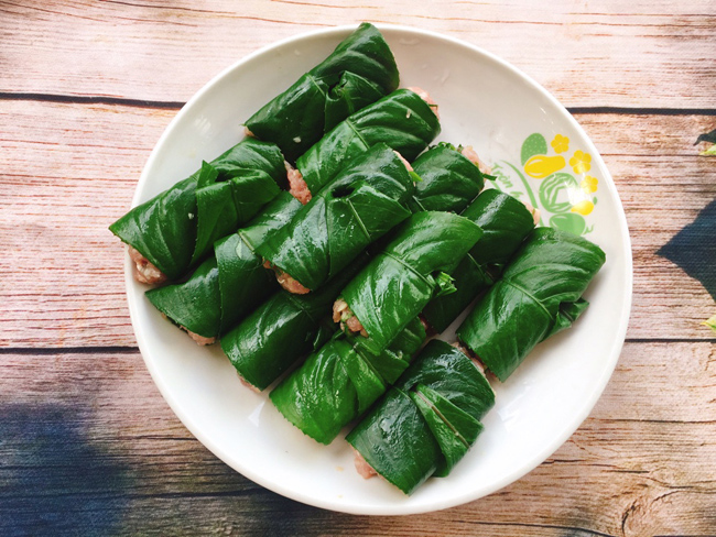 – Trải lá xương sông ra, múc từng muỗng thịt đặt vào bên trong rồi cuốn lại. Dùng phần cuống ghim vào phần chả để cố định cho chả khỏi bị bung ra. Làm như vậy đến khi hết phần thịt làm chả.