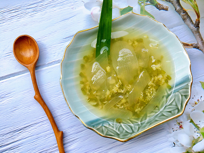 Chè đậu xanh nha đam đường phèn với những miếng nha đam giòn mát sần sật, đậu xanh bùi thơm hấp dẫn.