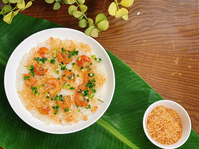 Món cơm cháy thưởng thức khi còn nóng hổi giòn rụm, phần tôm rim dai dai, tôm chấy bông tơi thơm ngọt, nước sốt đậm đà, mỡ hành thơm phức.