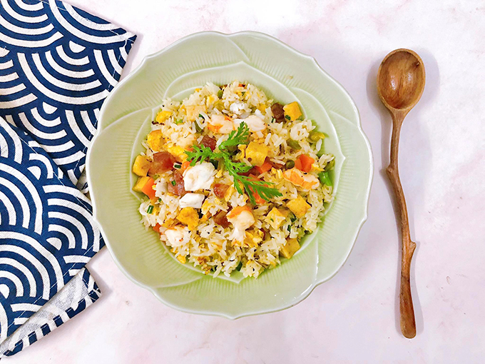 Hạt cơm chiên chín tơi rời, không quá khô, kết hợp cùng rau củ, thịt tôm ngọt, râu mực giòn giòn, hấp dẫn.