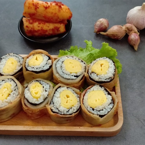 Cơm cuộn chẳng có gì lạ lẫm nhưng sự biến tấu thì luôn đa dạng với món ăn này. Lớp kimchi bọc phía ngoài sẽ là điểm nhấn giúp món ăn thêm đậm đà hương vị.
