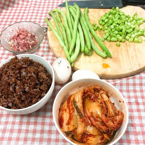 Cơm gạo lứt chiên kimchi đậu que siêu ngon, mềm mềm thơm thơm vô cùng, ăn 1 lần là ngây ngất ngất ngay luôn ý!