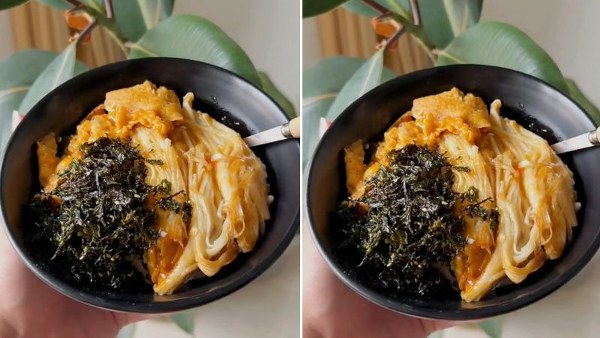 Cơm nóng mà ăn với nấm và trứng thì ngon lắm đấy. Cơm dẻo mềm, trứng béo thơm, đậm đà, có chút cay cay. Nấm kim châm dai dai giòn giòn. Thêm lá rong biển giòn rụm, thơm lừng rất hấp dẫn.