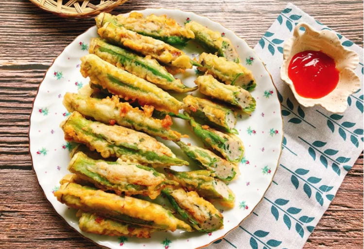 Đậu bắp nhồi cá thác lác, tẩm bột chiên giòn, chấm với tương ớt, là món ăn không mất nhiều thời gian chế biến lại bổ dưỡng.