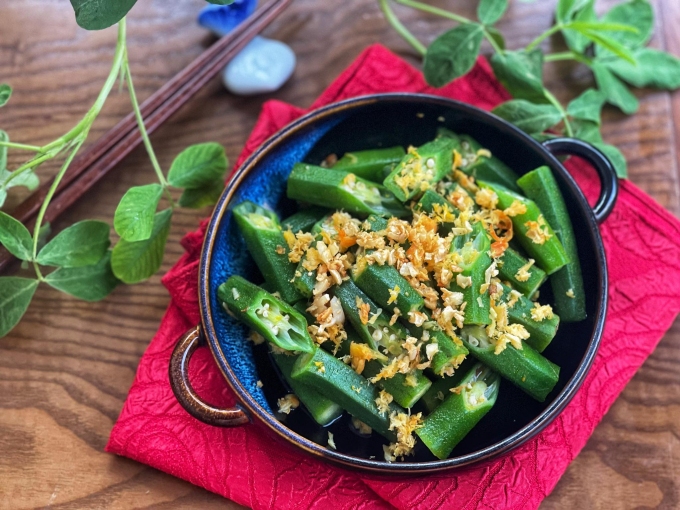 Đậu bắp vừa chín tới, giữ được màu xanh mướt, đậu thấm vị ngọt của tôm, cay của sa tế, dậy mùi tỏi phi.