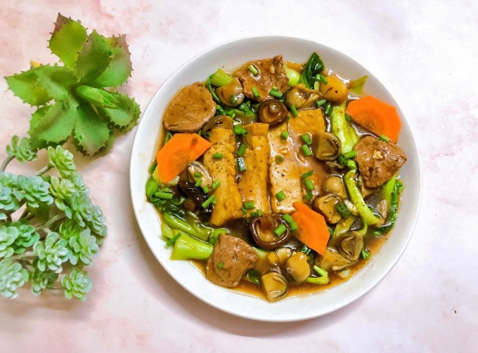 Đậu hũ vị béo thơm, ăn cùng phần xốt rau nấm ngọt thanh, lạ miệng, nhẹ bụng, phù hợp cho mâm cơm ngày rằm.