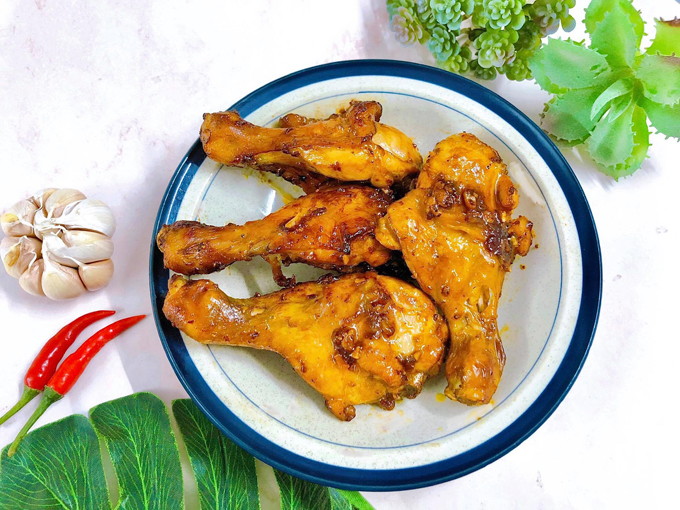 Đùi gà nướng đậm đà mùi tỏi, mật ong, cay cay vị hạt tiêu, gà không bị khô mà vẫn mềm, ăn cùng cơm nóng.