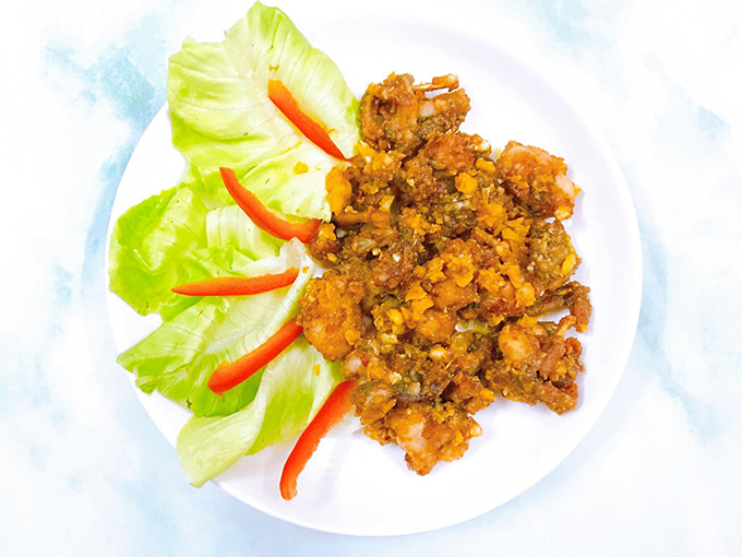 Ếch được bọc lớp trứng muối béo bùi thơm lừng, bên trong thịt dai ngọt không bị khô, ăn kèm rau sống, chấm tương ớt.