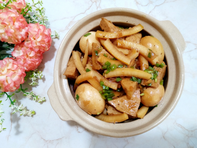 Thêm trứng vào đảo qua sau đó đun nhỏ lửa cho đến khi nước trong nồi cạn bớt và giò đã ngấm gia vị thì thêm hành lá thái nhỏ, bột tiêu vào rồi tắt bếp.