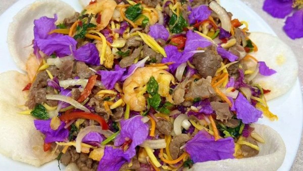 Gỏi hoa bằng lăng có màu sắc đẹp mắt, là món ăn lạ miệng kết hợp của nhiều hương vị rất kích thích vị giác.