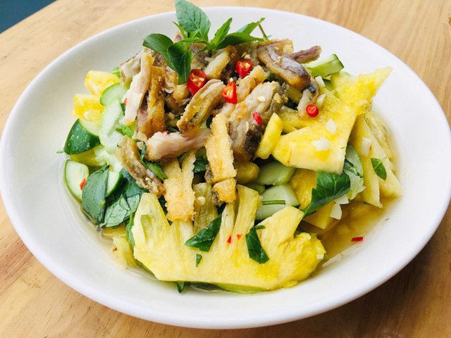 – Cho phần dứa, dưa, lá quế, cá vào tô, chan phần nước mắm vào trộn đều rồi cho ra đĩa. Ăn cùng cơm nóng, có thể cho và gỏi một ít ba chỉ heo luộc nếu thích.