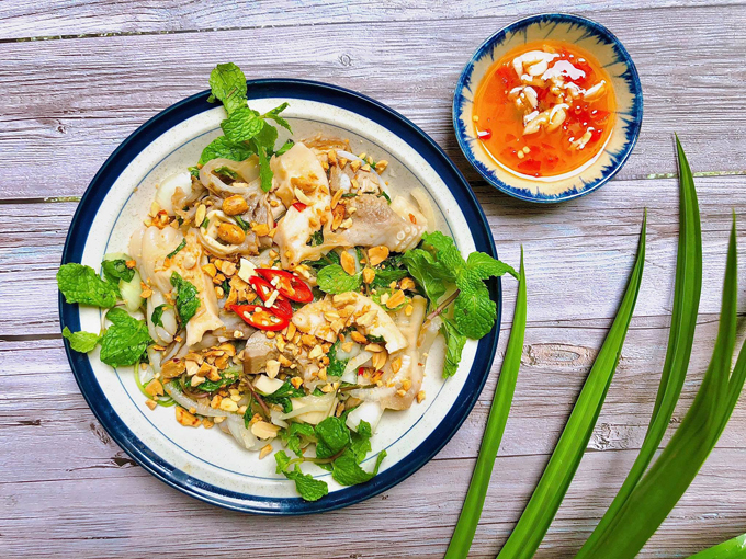 – Cho gỏi ra đĩa thêm đậu phộng rang giã nhuyễn lên trên. Khi ăn chấm cùng nước mắm chua ngọt.