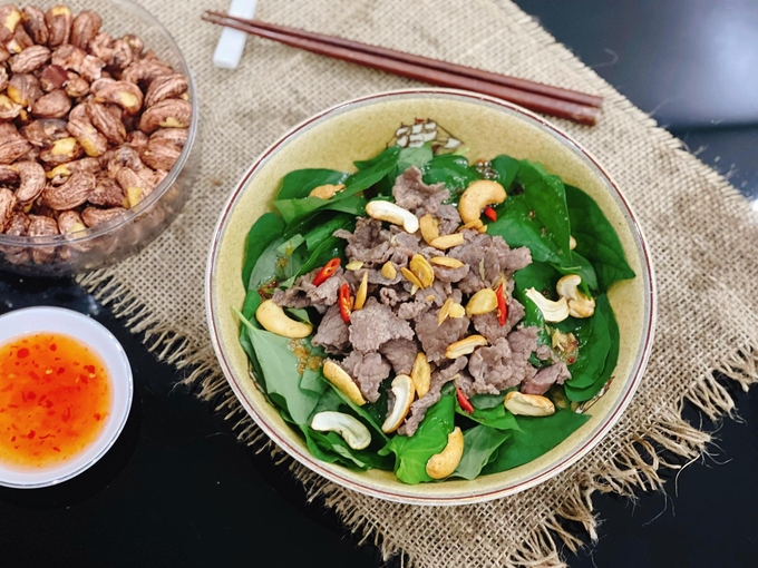 Rau diếp cá xanh mát, tươi giòn, ăn kèm những miếng thịt bò thơm ngon đậm đà và hạt điều bùi thơm tạo nên món thanh nhẹ, dễ ăn.