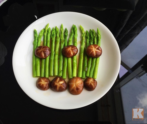 Nguyên liệu: 200g măng tây, 100g nấm đông cô, muối, dầu hào chay, bột nêm chay, dầu ăn, hạt tiêu.