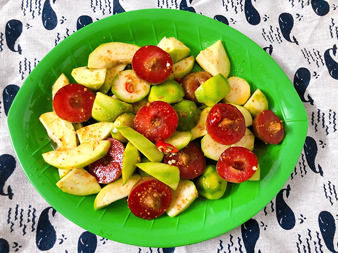 – Mận tách làm đôi bằng cách dùng đầu dao khứa một vòng ở giữa rồi dùng tay vặn để tách quả mận ra. Xoài bỏ đầu thái khoanh vừa ăn. Cóc chẻ đôi. Xoài và cóc có thể bỏ vỏ hoặc để nguyên tuỳ thích.