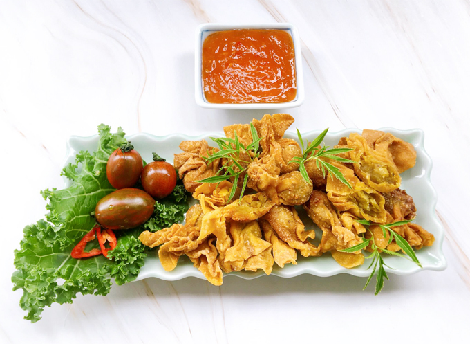 Hoành thánh giòn tan, bên trong nhân khoai béo ngọt hấp dẫn. Đây là món ngon không thể thiếu vào ngày ăn chay.