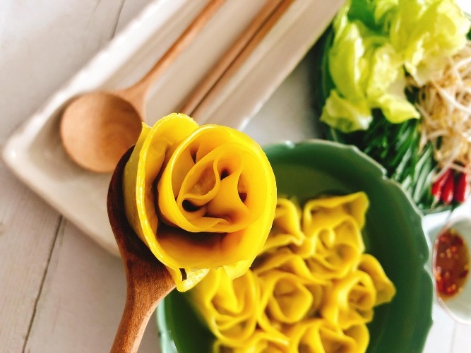 Viên hoành thánh màu vàng đẹp mắt, cuộn nhiều lớp nhìn như bông hoa, ăn kèm giá, hành hẹ, chấm mắm ớt.