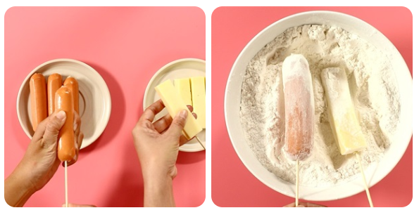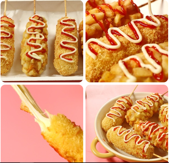 Hotdog Hàn Quốc đó là những que phô mai chiên giòn rụm hay những cây xúc xích được áo lớp bột và khoai tây bên ngoài, ăn kèm tương cà và sốt mayonnaise rất ngon.