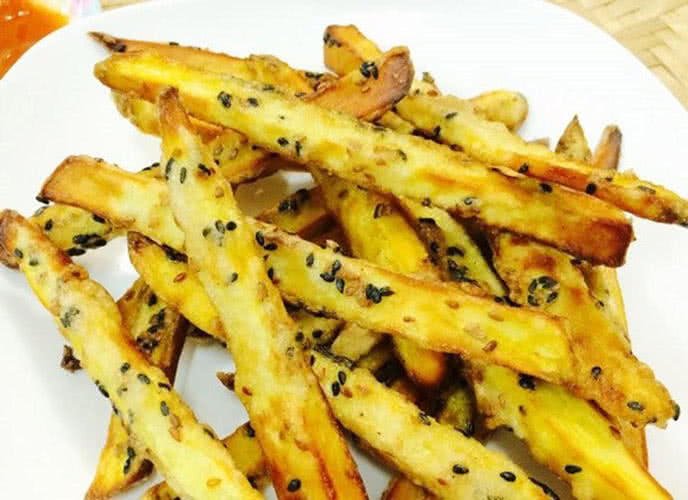 Món khoai lang chiên tẩm vừng rất thích hợp làm món ăn vặt.